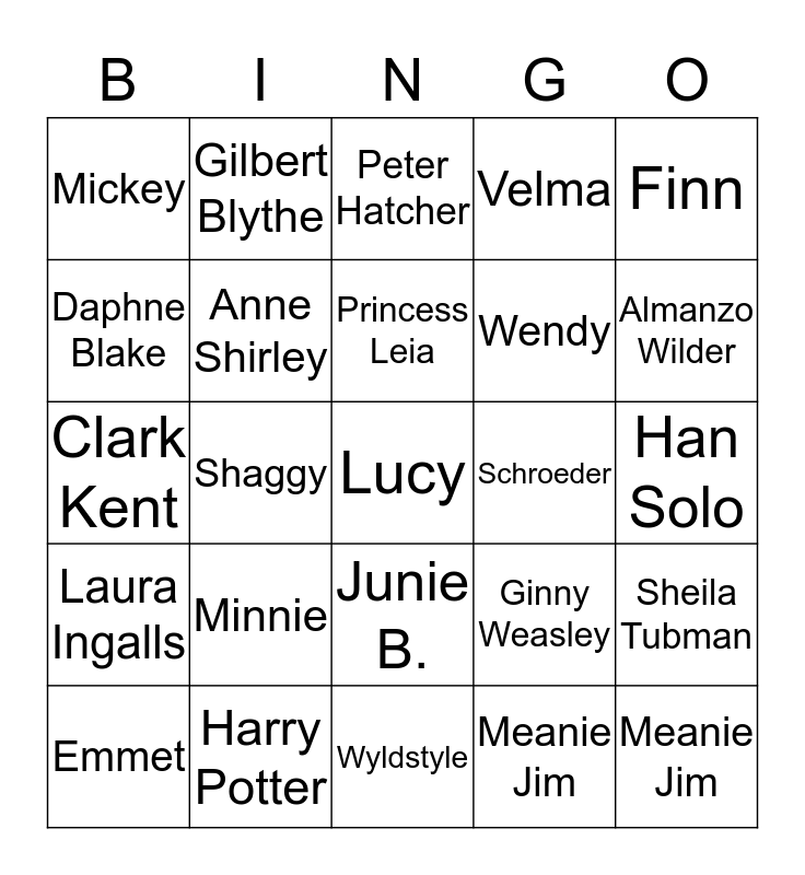 This bingo card has 32 words: Meanie Jim, Buzz, Shaggy, Peter Pan, Laura Ingalls, Anne Shirley, Finn, Sheila Tubman, Gilbert Blythe, Meanie Jim, Princess Leia, Peter Hatcher, Willa, Fred Jones, Schroeder, Lois Lane, Emmet, Clark Kent, Junie B., Minnie, Ginny Weasley, Kristoff, Han Solo, Harry Potter, Lucy, Velma, Wendy, Daphne Blake, Mickey, Wyldstyle, BoPeep and Almanzo Wilder.