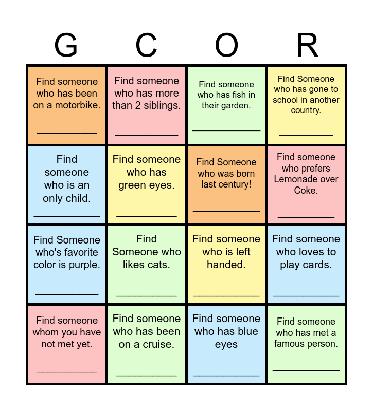 This bingo card has 26 words: Find Someone Who was born in March ____________, Find Someone who plays a musical instrument. ___________, Find someone who is left handed. ___________, Find Someone Who has a degree or is studying for one. ____________, Find someone who is an only child. ___________, Find someone who has more than 2 siblings. ___________, Find Someone who was born last century! _____________, Find Someone who has gone to school in another country. ___________, Find someone who has a Dog., Find Someone who likes cats. __________, Find someone who has blue eyes ___________, Find someone who prefers Lemonade over Coke. ___________, Find someone who speaks another language other than English ____________, Find someone who has been on a cruise. __________, Find 2 people who have the same birthday. ___________, Find someone who is shorter than you. _____________, Find someone who has been on a motorbike. ___________, Find someone who has green eyes. __________, Find someone who has fish in their garden. ______________, Find someone who loves to play cards. ___________, Find someone whom you have not met yet. ___________, Find someone who has a tattoo ___________, Find someone who does not like chocolate. ___________, Find someone who has met a famous person. _____________, Find Someone who's favorite color is purple. ___________ and Find someone who is wearing a blue shirt. ____________.
