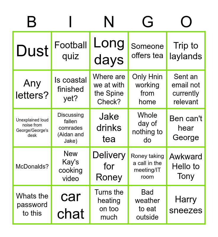 This bingo card has a free space and 47 words: How's ESHT going, Harry sneezes, George has no shoes on, Turns the heating on too much, New Kay's cooking video, Final Fantasy talk, Football quiz, Hnin has meetings, Any letters?, Edan's phone notifications loud, Is coastal finished yet?, Someone offers tea, Awkward Hello to Tony, Roney taking a call in the meeting/IT room, Hnin buys laylands, The clicking, Where are we at with the Spine Check?, Whole day of nothing to do, A tin can is discussed, Trip to laylands, Discussing fallen comrades (Aidan and Jake), Bad weather to eat outside, Dust, Only Hnin working from home, Hnin confusing the chat, Sent an email not currently relevant, Whats the password to this, Data breach clock is reset, Delivery for Roney, McDonalds?, Rimon falls asleep, Who's birthday next?, Someone's headphones being too loud, Impossible to plan anything, Utter incompetence, car chat, Ben can't hear George, Kennedy is slow, Weekend plans? on or before Wednesday, George eats his lunch for breakfast, Harry groaning, Long days, Unexplained loud noise from George/George's desk, Rimon makes glass screens rattle, Yulia says good morning, Lizzie using blender and Doorbell is spammed.