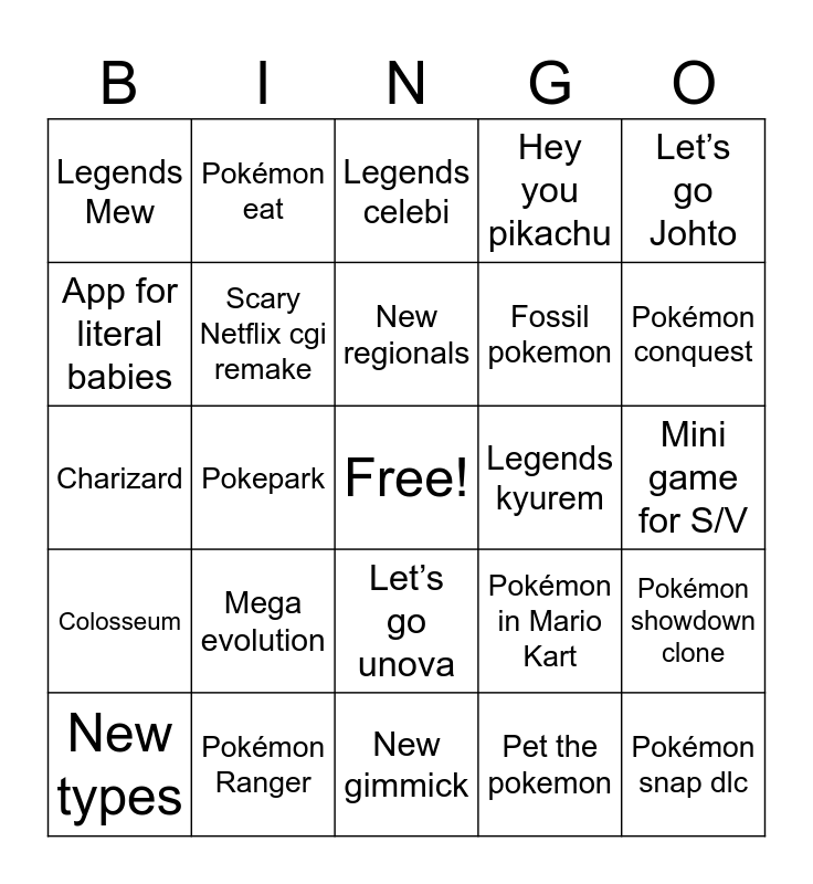 This bingo card has a free space and 24 words: Mega evolution, Pokémon Ranger, New regionals, New types, Let’s go Johto, Legends Mew, App for literal babies, Pokémon eat, Legends kyurem, Let’s go unova, Fossil pokemon, Charizard, Pokémon in Mario Kart, Pokémon showdown clone, Scary Netflix cgi remake, Pet the pokemon, Mini game for S/V, Legends celebi, Pokémon conquest, Pokepark, Pokémon snap dlc, Colosseum, Hey you pikachu and New gimmick.