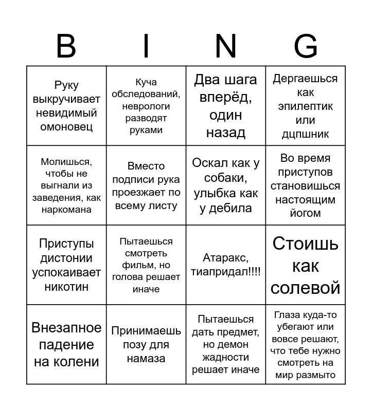 This bingo card has 16 words: Принимаешь позу для намаза, Стоишь как солевой, Два шага вперёд, один назад, Руку выкручивает невидимый омоновец, Приступы дистонии успокаивает никотин, Куча обследований, неврологи разводят руками, Атаракс, тиапридал!!!!, Пытаешься дать предмет, но демон жадности решает иначе, Молишься, чтобы не выгнали из заведения, как наркомана, Вместо подписи рука проезжает по всему листу, Внезапное падение на колени, Дергаешься как эпилептик или дцпшник, Пытаешься смотреть фильм, но голова решает иначе, Во время приступов становишься настоящим йогом, Оскал как у собаки, улыбка как у дебила and Глаза куда-то убегают или вовсе решают, что тебе нужно смотреть на мир размыто.