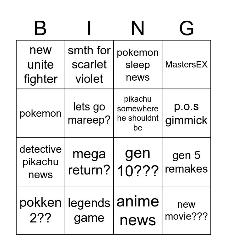 This bingo card has 16 words: legends game, gen 5 remakes, pokemon sleep news, new unite fighter, detective pikachu news, smth for scarlet violet, gen 10???, anime news, pokemon, lets go mareep?, pokken 2??, MastersEX, mega return?, p.o.s gimmick, pikachu somewhere he shouldnt be and new movie???.