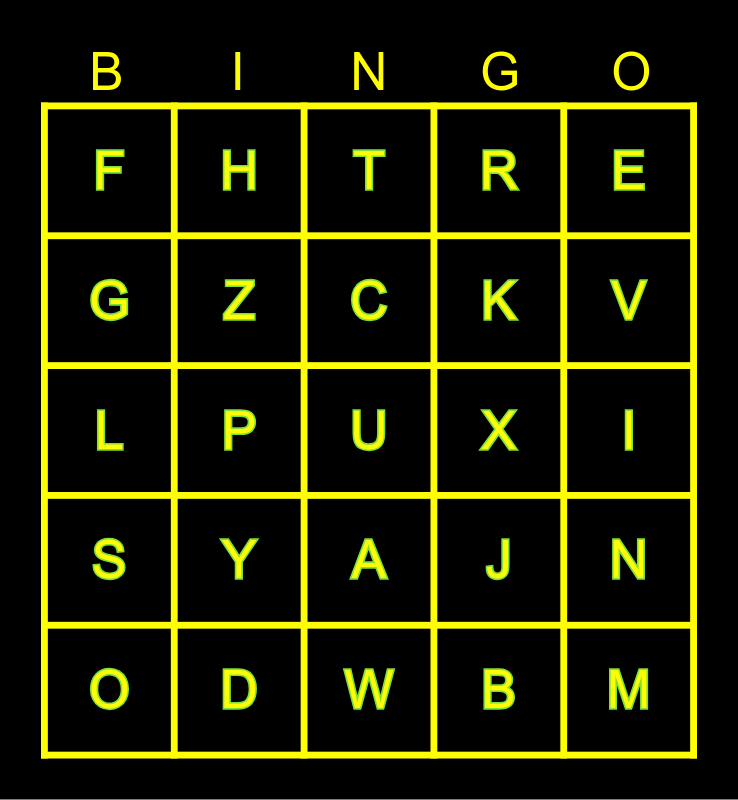 This bingo card has 26 words: A, B, C, D, E, F, G, H, I, J, K, L, N, O, P, Q, R, S, T, U, V, W, X, Y, Z and M.
