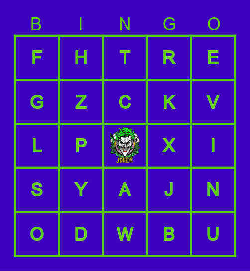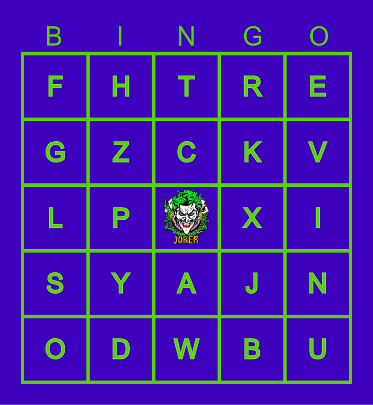 This bingo card has a free space and 26 words: A, B, C, D, E, F, G, H, I, J, K, L, N, O, P, Q, R, S, T, U, V, W, X, Y, Z and M.