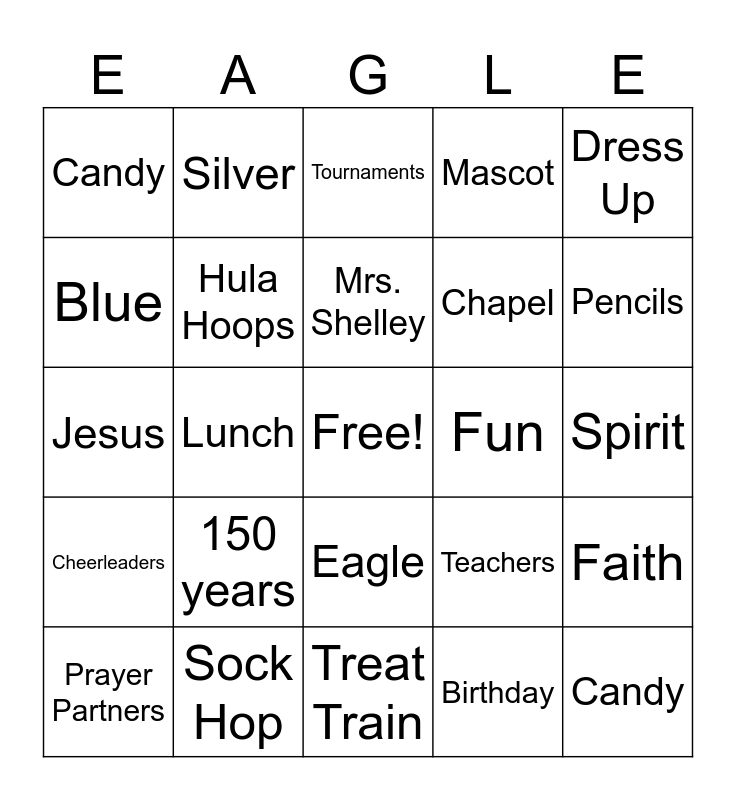 This bingo card has a free space and 26 words: Eagle, Birthday, Mrs. Shelley, Sock Hop, Dress Up, Candy, Blue, Silver, Spirit, Teachers, Chapel, Jesus, Faith, Prayer Partners, Lunch, Pizza, Mascot, Cheerleaders, Tournaments, Candy, Pencils, Treat Train, Fun, 150 years, Hula Hoops and Trunk or Treat.