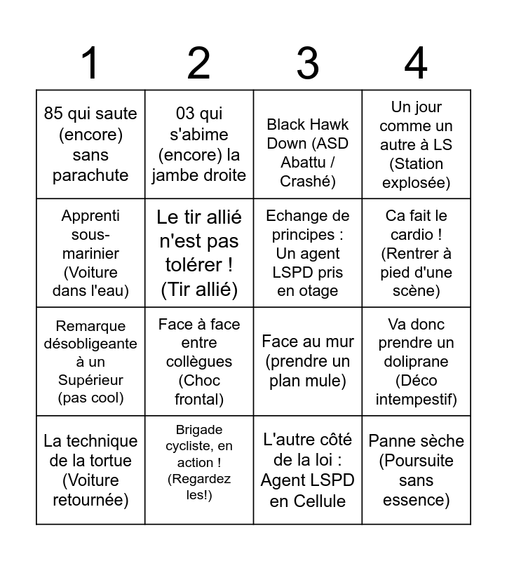This bingo card has 16 words: Brigade cycliste, en action ! (Regardez les!), Va donc prendre un doliprane (Déco intempestif), Black Hawk Down (ASD Abattu / Crashé), 85 qui saute (encore) sans parachute, Remarque désobligeante à un Supérieur (pas cool), 03 qui s'abime (encore) la jambe droite, Face au mur (prendre un plan mule), L'autre côté de la loi : Agent LSPD en Cellule, Apprenti sous-marinier (Voiture dans l'eau), Le tir allié n'est pas tolérer ! (Tir allié), La technique de la tortue (Voiture retournée), Un jour comme un autre à LS (Station explosée), Face à face entre collègues (Choc frontal), Ca fait le cardio ! (Rentrer à pied d'une scène), Echange de principes : Un agent LSPD pris en otage and Panne sèche (Poursuite sans essence).