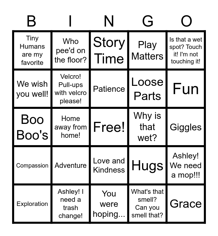 This bingo card has a free space and 24 words: Adventure, Ashley! I need a trash change!, Patience, Exploration, Is that a wet spot? Touch it! I'm not touching it!, Tiny Humans are my favorite, We wish you well!, Who pee'd on the floor?, Why is that wet?, Love and Kindness, Loose Parts, Boo Boo's, Hugs, Ashley! We need a mop!!!, Velcro! Pull-ups with velcro please!, What's that smell? Can you smell that?, Giggles, Story Time, Fun, Home away from home!, Grace, Compassion, Play Matters and You were hoping....