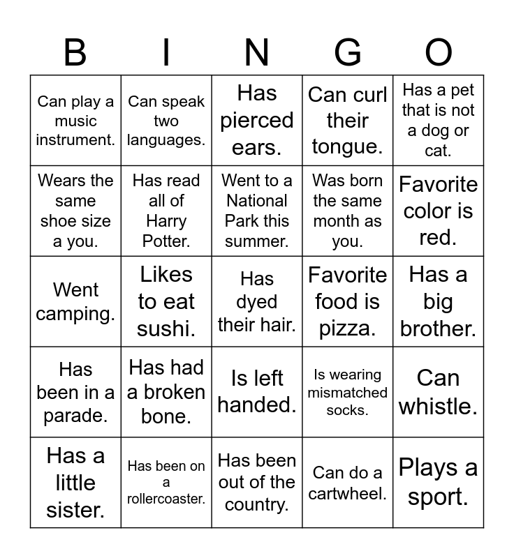 This bingo card has 25 words: Has had a broken bone., Has been out of the country., Went to a National Park this summer., Has a little sister., Has a pet that is not a dog or cat., Can play a music instrument., Wears the same shoe size a you., Can speak two languages., Favorite food is pizza., Is left handed., Was born the same month as you., Went camping., Is wearing mismatched socks., Can whistle., Has read all of Harry Potter., Plays a sport., Has a big brother., Has pierced ears., Favorite color is red., Likes to eat sushi., Has dyed their hair., Has been on a rollercoaster., Has been in a parade., Can curl their tongue. and Can do a cartwheel..