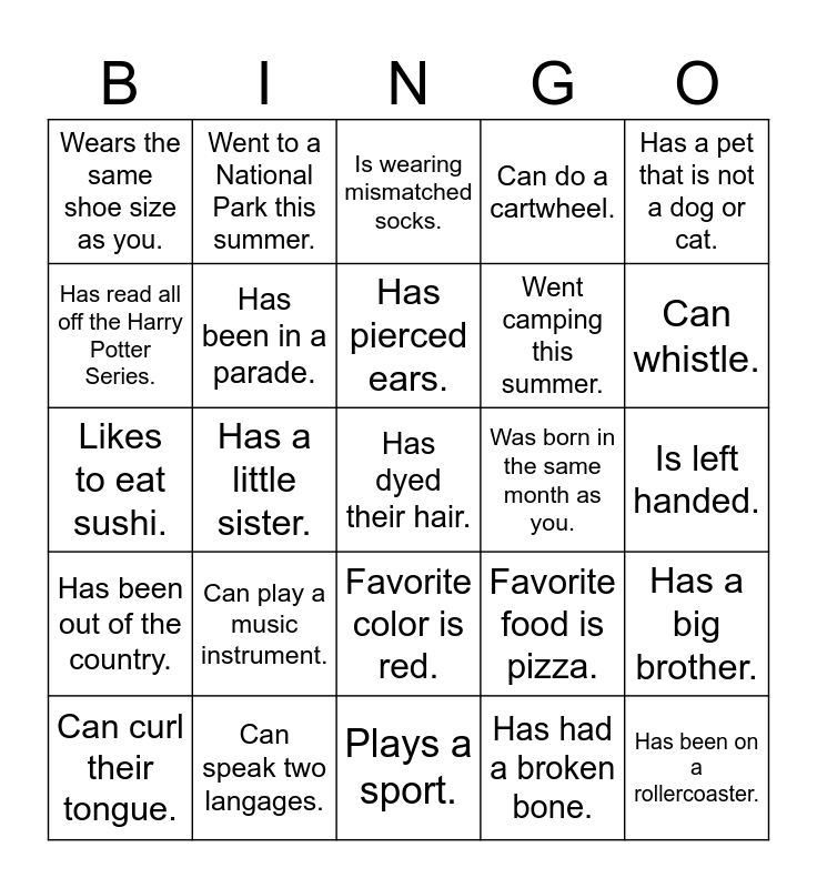 This bingo card has a free space and 24 words: Can play a music instrument., Can speak two langages., Has pierced ears., Can curl their tongue., Has a pet that is not a dog or cat., Wears the same shoe size as you., Has read all off the Harry Potter Series., Went to a National Park this summer., Was born in the same month as you., Favorite color is red., Went camping this summer., Likes to eat sushi., Favorite food is pizza., Has a big brother., Has been in a parade., Has had a broken bone., Is left handed., Is wearing mismatched socks., Can whistle., Has a little sister., Has been on a rollercoaster., Has been out of the country., Can do a cartwheel. and Plays a sport..