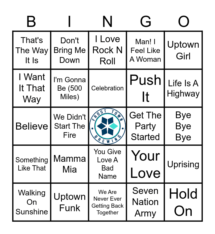 This bingo card has a free space and 79 words: SexyBack, Don't Stop Believin', I Love Rock N Roll, You Shook Me All Night Long, Girls Just Want To Have Fun, I Wanna Dance With Somebody, 9 To 5, Bohemian Rhapsody, Wannabe, Single Ladies, Poker Face, Shake It Off, Man! I Feel Like A Woman, That's The Way It Is, Dancing Queen, I Want It That Way, Mambo No. 5, Mamma Mia, YMCA, Bye Bye Bye, Love Shack, Uptown Girl, Believe, Celebration, I'm Gonna Be (500 Miles), It's Raining Men, All Star, Never Gonna Give You Up, Hey Ya!, Since U Been Gone, Life Is A Highway, Stacy's Mom, We Are Never Ever Getting Back Together, Call Me Maybe, Walking On Sunshine, Get The Party Started, All Summer Long, Baby, ABC, Hold On, Jack & Diane, I'll Be There For You, 867-5309, Bad Moon Rising, Detroit Rock City, Don't Bring Me Down, Dude (Looks Like A Lady), Edge Of Seventeen, The Power Of Love, Rock You Like A Hurricane, Uprising, We Didn't Start The Fire, Your Love, What's Love Got To Do With It, Let's Groove, Come On Eileen, Any Way You Want It, Heaven Is A Place On Earth, Material Girl, You Give Love A Bad Name, Push It, Someday, Troublemaker, Fly, Every Morning, Cowboy Casanova, Dust On The Bottle, Country Girl (Shake It For Me), Drink In My Hand, Something Like That, Uptown Funk, We Found Love, New Rules, Lean On, Basket Case, Seven Nation Army, Bring Me To Life, Smells Like Teen Spirit and Sympathy For The Devil.