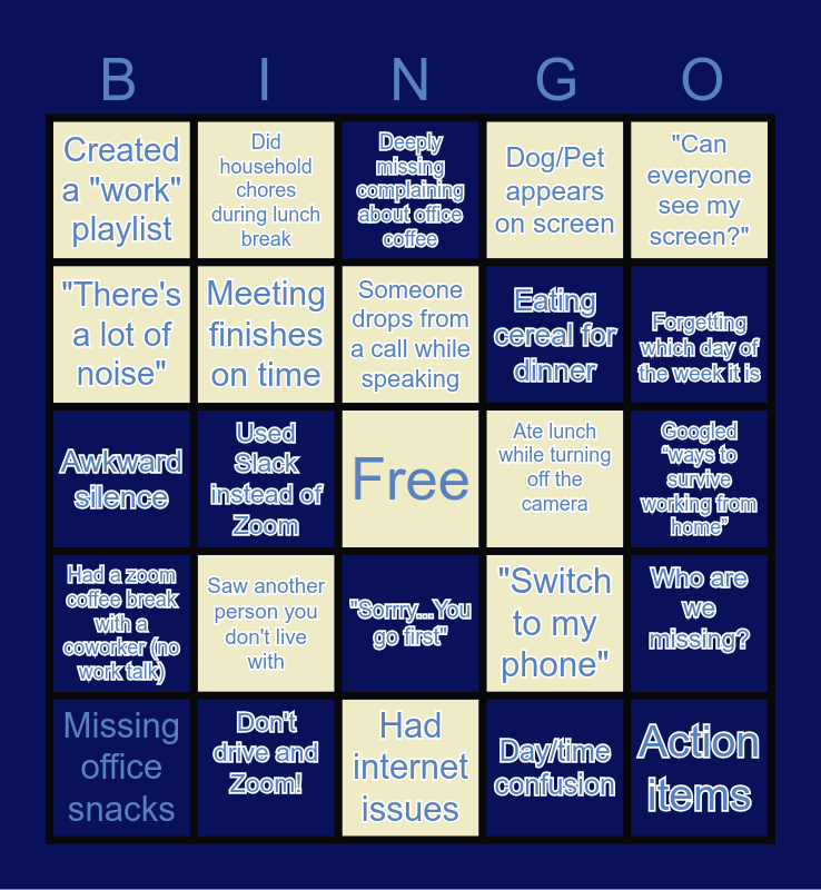 This bingo card has a free space and 65 words: Saw a co-worker in person, "Can you hear me?", Joked about long "commute", Meeting interrupted by family member, Wore pajamas to a meeting, Kid screams in background, Did household chores during lunch break, Ordered food during call, "Switch to my phone", Can you say that again?, "There's a lot of noise", "Can you hear me now?", "Sorry, I was on mute", "Can everyone see my screen?", Used an emoji in an email, Meeting finishes on time, Someone drops from a call while speaking, Dog/Pet appears on screen, Did chair yoga, Created a "work" playlist, Saw another person you don't live with, Had internet issues, Ate lunch while turning off the camera, VPN Issues, Spent at least 15 minutes looking for a perfect zoom background, Crashed someone else’s meeting URL/Link., Took a nap during the lunch break, "I have a hard stop", Forgetting which day of the week it is, Had Zoom meetings from backyard, Don't drive and Zoom!, Drinking too much coffee, Kitchen table is my new desk, Fixed hair 5 mins before a call, Awkward silence, Attended a Zoom meeting that should have been an email….., Free!, Day/time confusion, Who are we missing?, "I have to drop off for another meeting", Used Slack instead of Zoom, "Sorrry...You go first", Turned off my camera because of bad hair day, Yelled “I’m on a call! Be quiet”, Woke up 5 minutes before a meeting, Started using miore “/giphy” in slack messages, Deeply missing complaining about office coffee, Didn’t check any social media during work, Action items, Had a zoom coffee break with a coworker (no work talk), Shared pictures of my lunch, Had awkward small talk while waiting for all the people to join the call, Shopping too much from Amazon, Googled “ways to survive working from home”, Joked about Covid, Looking forward to going grocery shopping, Woke up ready to work on a Saturday morning., Eating cereal for dinner, Kitchen trips every 20 minutes, Missing office snacks, Doorbell rang while on a Zoom call, Zoom audio call only because you weren't camera ready, Eating cereal for lunch, Skipping breakfast and Got a haircut.