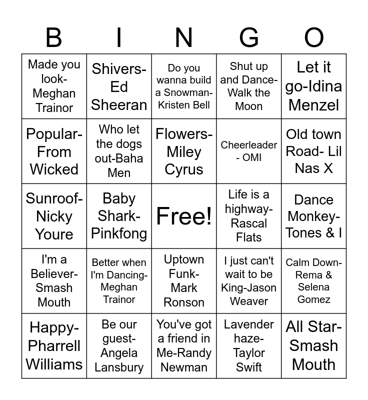 This bingo card has a free space and 29 words: Happy-Pharrell Williams, Cake by the Ocean- DNCE, Baby Shark-Pinkfong, Shake it off-Taylor Swift, Made you look-Meghan Trainor, Do you wanna build a Snowman- Kristen Bell, Who let the dogs out-Baha Men, Better when I'm Dancing-Meghan Trainor, Life is a highway-Rascal Flats, Be our guest-Angela Lansbury, Dance Monkey-Tones & I, All Star-Smash Mouth, You've got a friend in Me-Randy Newman, Lavender haze-Taylor Swift, Old town Road- Lil Nas X, Under the Sea-Samuel Wright, Uptown Funk- Mark Ronson, I'm a Believer- Smash Mouth, Let it go-Idina Menzel, Sunroof-Nicky Youre, I just can't wait to be King-Jason Weaver, Sweet Caroline- Neil Diamond, Cheerleader - OMI, Popular-From Wicked, Shut up and Dance- Walk the Moon, Shivers-Ed Sheeran, Calm Down- Rema & Selena Gomez, Flowers-Miley Cyrus and Can't stop the Feeling- Justin Timberlake.