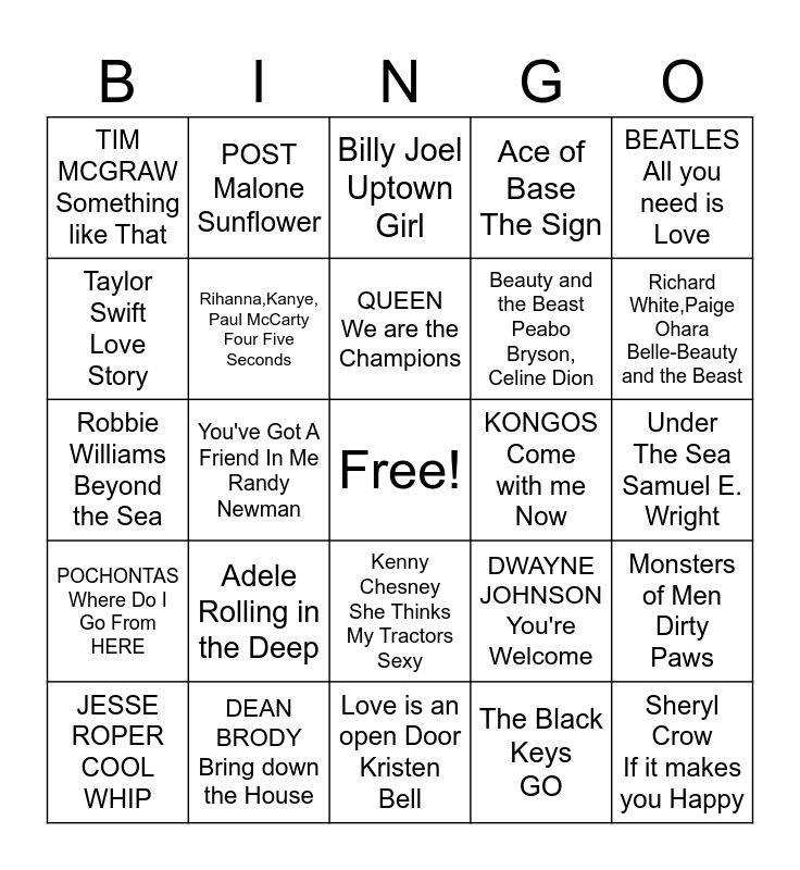 This bingo card has a free space and 24 words: Adele Rolling in the Deep, DEAN BRODY Bring down the House, QUEEN We are the Champions, JESSE ROPER COOL WHIP, BEATLES All you need is Love, TIM MCGRAW Something like That, Taylor Swift Love Story, POST Malone Sunflower, KONGOS Come with me Now, Kenny Chesney She Thinks My Tractors Sexy, Beauty and the Beast Peabo Bryson, Celine Dion, Robbie Williams Beyond the Sea, DWAYNE JOHNSON You're Welcome, Monsters of Men Dirty Paws, Rihanna,Kanye, Paul McCarty Four Five Seconds, The Black Keys GO, Under The Sea Samuel E. Wright, Billy Joel Uptown Girl, Richard White,Paige Ohara Belle-Beauty and the Beast, You've Got A Friend In Me Randy Newman, Sheryl Crow If it makes you Happy, POCHONTAS Where Do I Go From HERE, Ace of Base The Sign and Love is an open Door Kristen Bell.