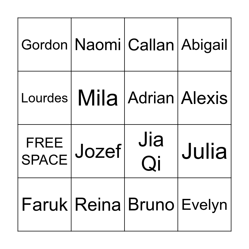 This bingo card has 20 words: Julia, Ryan, Callan, Liana, Faruk, Lourdes, Reina, Gordon, FREE SPACE, Naomi, Jozef, Jia Qi, Mila, Evelyn, Adrian, Samuel, Alexis, Abigail, Bruno and Danny.