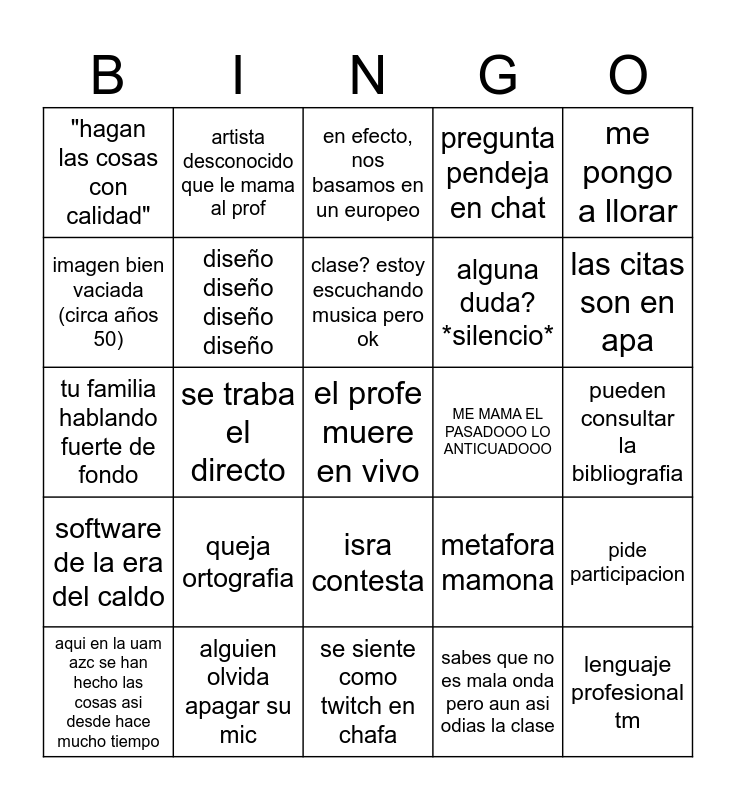 This bingo card has a free space and 24 words: queja ortografia, alguien olvida apagar su mic, clase? estoy escuchando musica pero ok, aqui en la uam azc se han hecho las cosas asi desde hace mucho tiempo, me pongo a llorar, "hagan las cosas con calidad", imagen bien vaciada (circa años 50), artista desconocido que le mama al prof, ME MAMA EL PASADOOO LO ANTICUADOOO, isra contesta, alguna duda? *silencio*, tu familia hablando fuerte de fondo, metafora mamona, pide participacion, diseño diseño diseño diseño, sabes que no es mala onda pero aun asi odias la clase, pueden consultar la bibliografia, en efecto, nos basamos en un europeo, las citas son en apa, se traba el directo, lenguaje profesional tm, software de la era del caldo, pregunta pendeja en chat and se siente como twitch en chafa.