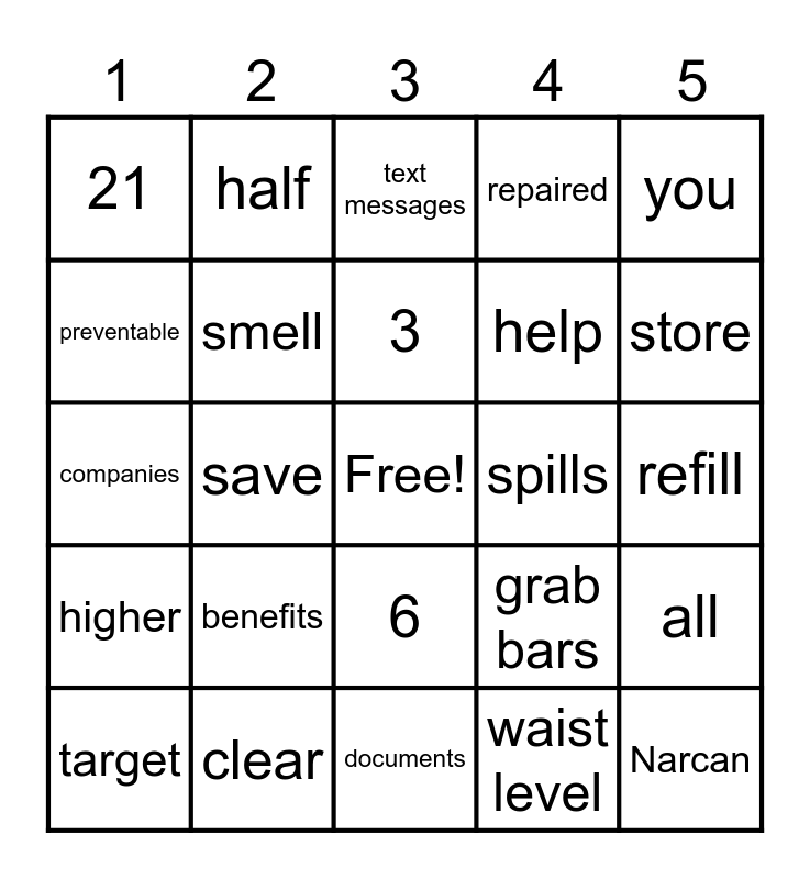 This bingo card has a free space and 39 words: 25, Quitline, 1, grab bars, all, higher, save, windowless, spills, refill, preventable, half, hand rails, store, companies, benefits, 6, repaired, expired, target, smell, 3, waist level, you, chemicals, clear, documents, pets, affording, 21, 20, alerts, help, Narcan, flavors, encourage, text messages, grabbers and lock box.