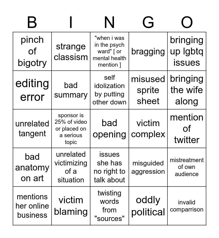 This bingo card has a free space and 24 words: mentions her online business, unrelated victimizing of a situation, self idolization by putting other down, oddly political, bringing up lgbtq issues, pinch of bigotry, strange classism, "when i was in the psych ward" [ or mental health mention ], victim complex, mention of twitter, unrelated tangent, bad summary, misguided aggression, mistreatment of own audience, editing error, victim blaming, twisting words from "sources", bragging, bringing the wife along, bad anatomy on art, sponsor is 25% of video or placed on a serious topic, issues she has no right to talk about, misused sprite sheet and invalid comparrison.