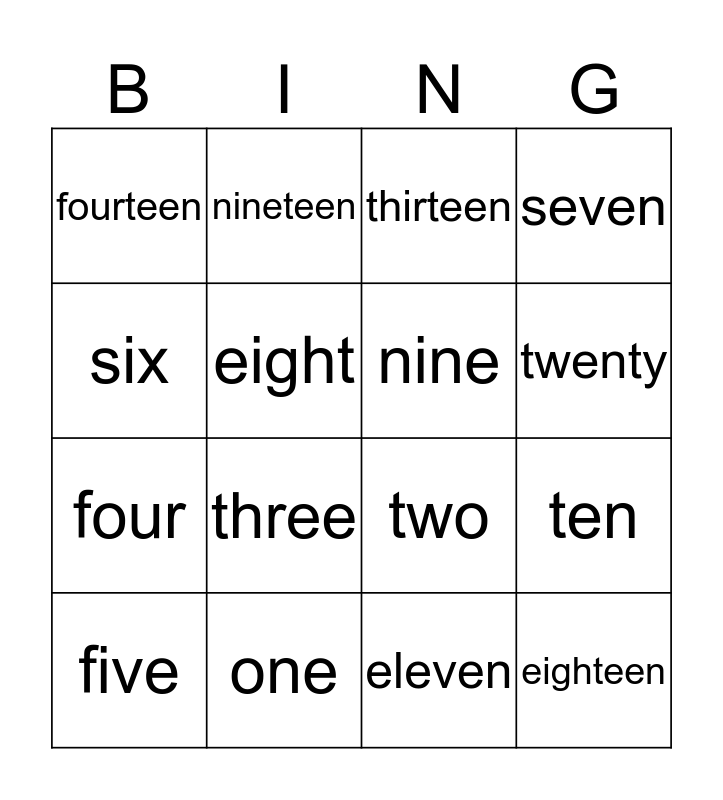 This bingo card has 16 words: one, ten, thirteen, fourteen, four, nineteen, two, eleven, six, eight, five, seven, three, twenty, nine and eighteen.