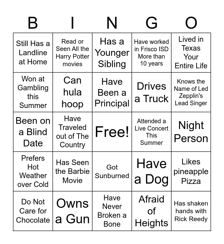 This bingo card has a free space and 24 words: Has Seen the Barbie Movie, Owns a Gun, Have Been a Principal, Do Not Care for Chocolate, Lived in Texas Your Entire Life, Still Has a Landline at Home, Won at Gambling this Summer, Read or Seen All the Harry Potter movies, Attended a Live Concert This Summer, Got Sunburned, Drives a Truck, Been on a Blind Date, Have a Dog, Likes pineapple Pizza, Can hula hoop, Afraid of Heights, Night Person, Has a Younger Sibling, Knows the Name of Led Zepplin's Lead Singer, Have Traveled out of The Country, Has shaken hands with Rick Reedy, Prefers Hot Weather over Cold, Have worked in Frisco ISD More than 10 years and Have Never Broken a Bone.