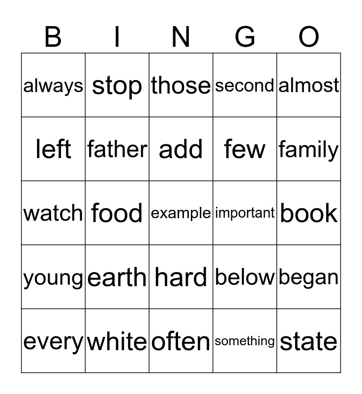 This bingo card has a free space and 29 words: every, near, food, between, always, those, father, earth, important, white, book, state, often, something, family, open, hard, young, almost, watch, below, once, few, left, second, stop, began, add and own.