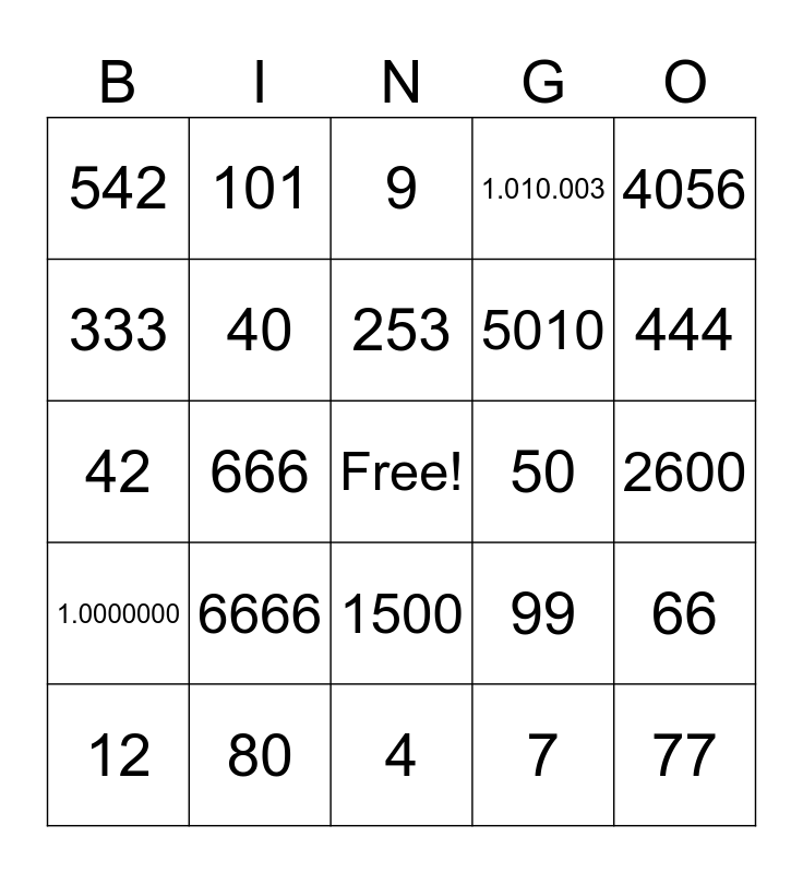 This bingo card has a free space and 64 words: 16, 20, 30, 66, 18, 87, 101, 200, 253, 1001, 1500, 2023, 2600, 4056, 4700, 333, 666, 542, 702, 5010, 6666, 1.0000000, 1.010.003, 1.500.000, 2.347.951, 3.450.497, 9.866.712, 4.315.411, 8.951.753, 740, 809, 932, 2003, 3047, 444, 12, 14, 7, 10, 40, 42, 50, 53, 60, 70, 77, 80, 90, 99, 1, 2, 3, 4, 5, 6, 8, 9, 11, 13, 15, 17, 19, 6.333.222 and 7.200.000.