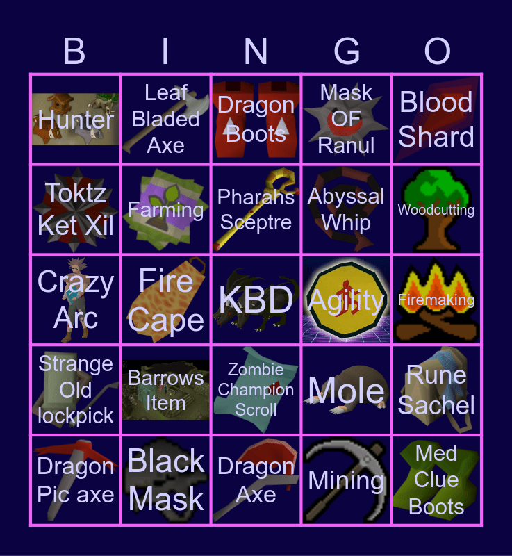 This bingo card has 25 images and 25 words: Strange Old lockpick, Black Mask, KBD, Mining, Blood Shard, Hunter, Leaf Bladed Axe, Dragon Boots, Agility, Rune Sachel, Toktz Ket Xil, Farming, Dragon Axe, Mole, Woodcutting, Dragon Pic axe, Fire Cape, Pharahs Sceptre, Abyssal Whip, Firemaking, Crazy Arc, Barrows Item, Zombie Champion Scroll, Mask OF Ranul and Med Clue Boots.