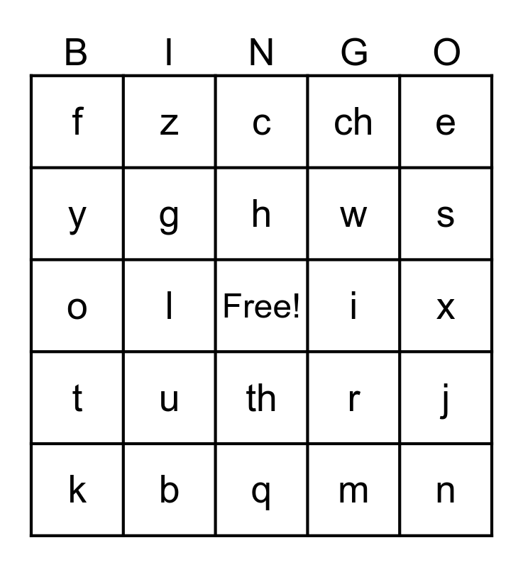 This bingo card has a free space and 29 words: a, b, c, d, e, f, g, h, i, j, k, l, m, n, o, p, q, r, s, t, u, v, w, x, y, z, th, ch and sh.