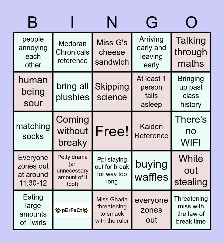 This bingo card has 1 images, a free space and 23 words: Petty drama (an unnecessary amount of it too!), Skipping science, Eating large amounts of Twirls, Talking through maths, people annoying each other, human being sour, Medoran Chronicals reference, Kaiden Reference, Ppl staying out for break for way too long, At least 1 person falls asleep, matching socks, buying waffles, White out stealing, bring all plushies, everyone zones out, There's no WIFI, Miss G's cheese sandwich, Bringing up past class history, Coming without breaky, Threatening miss with the law of break time, Everyone zones out at around 11:30-12, Arriving early and leaving early and Miss Ghada threatening to smack with the ruler.
