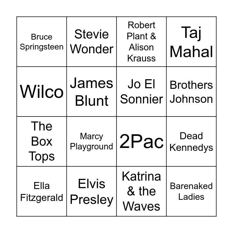 This bingo card has 22 words: Elvis Presley, The Marvelettes, Stevie Wonder, Stevie B, James Blunt, Jo El Sonnier, Bruce Springsteen, Robert Plant & Alison Krauss, 2Pac, Barenaked Ladies, The Box Tops, Taj Mahal, Son House, Bay City Rollers, Katrina & the Waves, Ringo Starr, Dead Kennedys, Ella Fitzgerald, Marcy Playground, Wilco, Brothers Johnson and Buddy Holly.