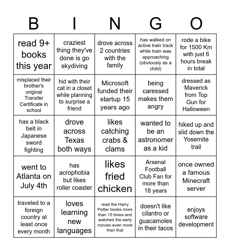 This bingo card has 25 words: has acrophobia but likes roller coaster, read the Harry Potter books more than 15 times and watched the early movies even more than that, Microsoft funded their startup 15 years ago, traveled to a foreign country at least once every month, rode a bike for 1500 Km with just 6 hours break in total, read 9+ books this year, misplaced their brother's original Transfer Certificate in school, craziest thing they've done is go skydiving, wanted to be an astronomer as a kid, likes fried chicken, being caressed makes them angry, has a black belt in Japanese sword fighting, Arsenal Football Club Fan for more than 18 years, once owned a famous Minecraft server, hid with their cat in a closet while planning to surprise a friend, enjoys software development, hiked up and slid down the Yosemite trail, drove across 2 countries with the family, dressed as Maverick from Top Gun for Halloween, drove across Texas both ways, likes catching crabs & clams, loves learning new languages, went to Atlanta on July 4th, has walked on active train track while train was approaching (obviously as a child) and doesn't like cilantro or guacamoles in their tacos.
