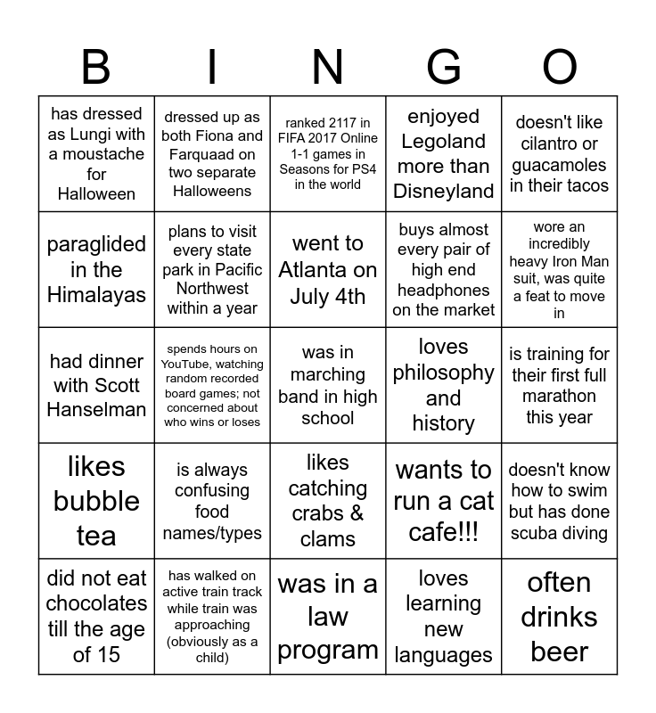 This bingo card has 26 words: likes catching crabs & clams, loves learning new languages, went to Atlanta on July 4th, has walked on active train track while train was approaching (obviously as a child), doesn't like cilantro or guacamoles in their tacos, has dressed as Lungi with a moustache for Halloween, paraglided in the Himalayas, dressed up as both Fiona and Farquaad on two separate Halloweens, is training for their first full marathon this year, wants to run a cat cafe!!!, buys almost every pair of high end headphones on the market, had dinner with Scott Hanselman, doesn't know how to swim but has done scuba diving, did not eat chocolates till the age of 15, spends hours on YouTube, watching random recorded board games; not concerned about who wins or loses, enjoys working out, enjoyed Legoland more than Disneyland, likes bubble tea, ranked 2117 in FIFA 2017 Online 1-1 games in Seasons for PS4 in the world, was in marching band in high school, wore an incredibly heavy Iron Man suit, was quite a feat to move in, was in a law program, loves philosophy and history, is always confusing food names/types, plans to visit every state park in Pacific Northwest within a year and often drinks beer.