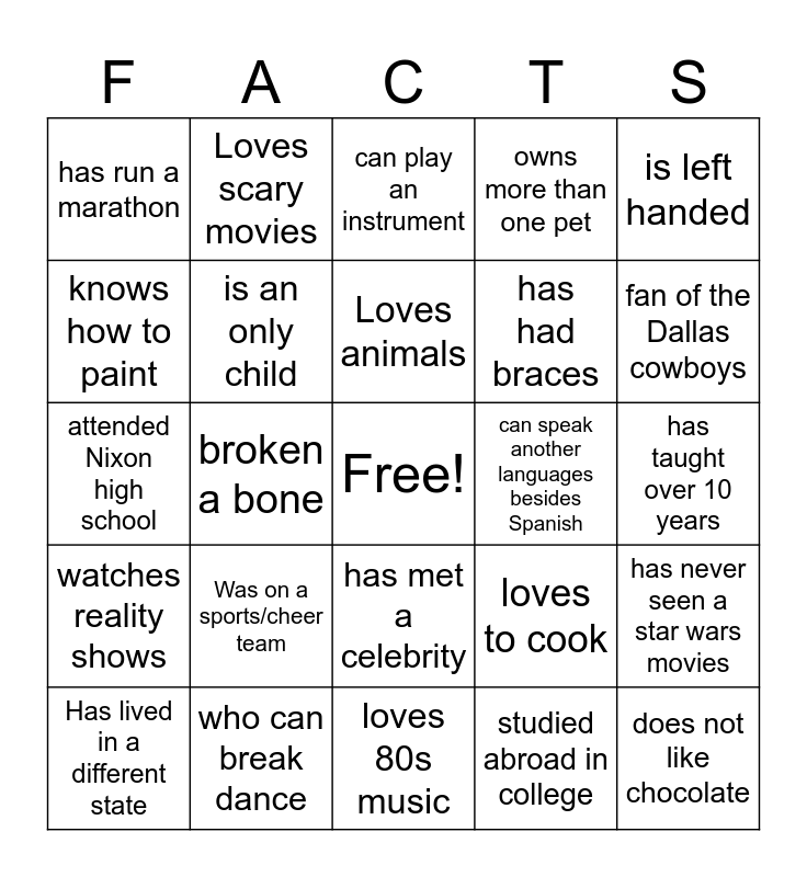 This bingo card has a free space and 24 words: Has lived in a different state, Was on a sports/cheer team, Loves animals, studied abroad in college, is left handed, has run a marathon, Loves scary movies, can play an instrument, can speak another languages besides Spanish, has taught over 10 years, attended Nixon high school, is an only child, loves to cook, has never seen a star wars movies, knows how to paint, who can break dance, loves 80s music, owns more than one pet, fan of the Dallas cowboys, watches reality shows, broken a bone, has met a celebrity, has had braces and does not like chocolate.