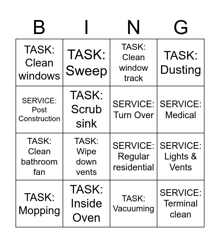 This bingo card has 41 words: Free!, SERVICE: Regular residential, SERVICE: Move In-Out, SERVICE: Turn Over, SERVICE: Commercial, SERVICE: Industrial, SERVICE: Medical, SERVICE: Construction, SERVICE: Post Construction, SERVICE: Terminal clean, SERVICE: Lights & Vents, TASK: Dusting, TASK: Mopping, TASK: Vacuuming, TASK: Inside Oven, TASK: Inside Fridge, TASK: Wipe down blinds, TASK: Clean windows, TASK: Clean storm doors, TASK: Clean window track, TASK: Wash walls, TASK: Wipe down baseboards, TASK: Vacuum inside vents, TASK: Clean bathroom fan, TASK: Clean dental office, TASK: Clean Insurance office, TASK: Clean hospital, TASK: Scrub floors, TASK: Wipe down vents, TASK: Clean inside ceiling lights, TASK: Wipe down ceiling fan, TASK: Sweep, TASK: Clean microwave, TASK: Wipe down countertops, TASK: Clean light fixtures, TASK: Scrub sink, TASK: Take trash out, TASK: Disinfect light switches, TASK: Disinfect hospital room, TASK: Wipe down front door and TASK: Wipe down pantry shelves.