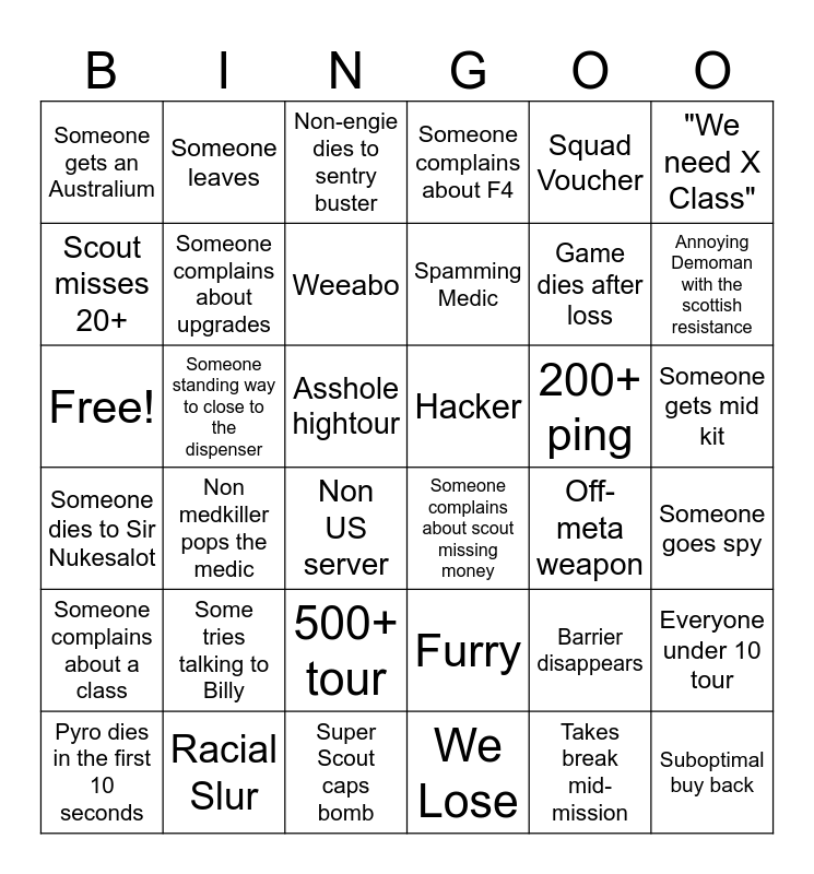 This bingo card has 36 words: Furry, 500+ tour, We Lose, Scout misses 20+, Someone dies to Sir Nukesalot, Hacker, Someone complains about upgrades, Super Scout caps bomb, Squad Voucher, Barrier disappears, Annoying Demoman with the scottish resistance, Someone complains about F4, Everyone under 10 tour, Someone standing way to close to the dispenser, Spamming Medic, Someone gets an Australium, Someone complains about a class, 200+ ping, Free!, Non-engie dies to sentry buster, Asshole hightour, Non medkiller pops the medic, Someone complains about scout missing money, Non US server, Off-meta weapon, Someone leaves, Game dies after loss, Racial Slur, Weeabo, "We need X Class", Suboptimal buy back, Pyro dies in the first 10 seconds, Someone goes spy, Someone gets mid kit, Some tries talking to Billy and Takes break mid-mission.