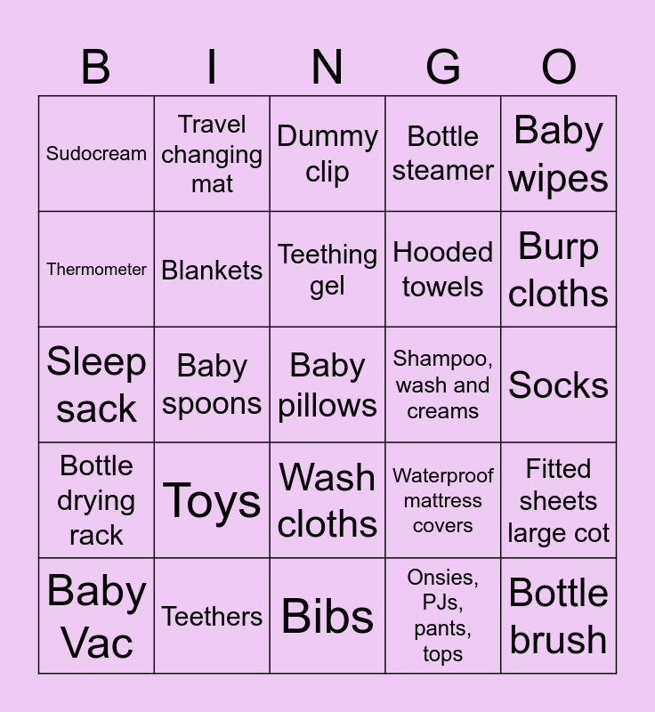 This bingo card has a free space and 24 words: Toys, Teethers, Teething gel, Baby Vac, Baby wipes, Sudocream, Thermometer, Travel changing mat, Shampoo, wash and creams, Wash cloths, Hooded towels, Sleep sack, Waterproof mattress covers, Fitted sheets large cot, Blankets, Onsies, PJs, pants, tops, Socks, Dummy clip, Burp cloths, Baby spoons, Bottle brush, Bottle drying rack, Bottle steamer and Bibs.