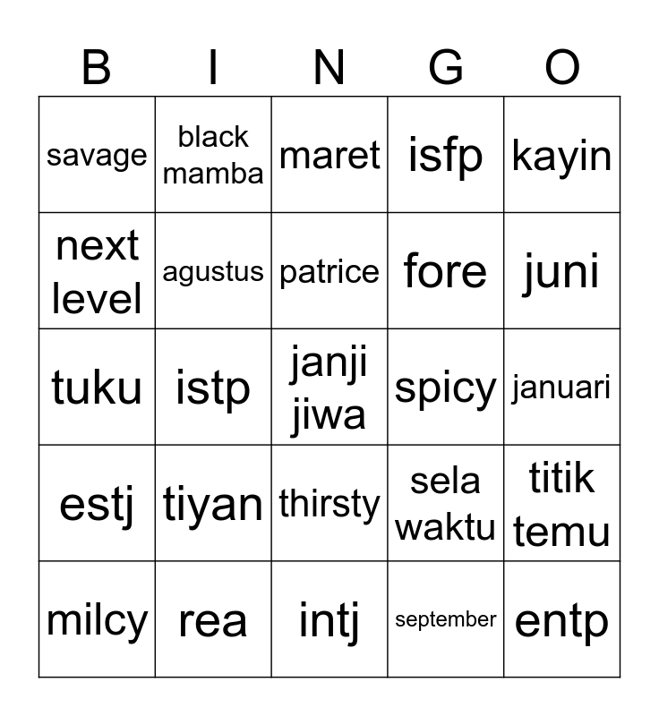 This bingo card has a free space and 24 words: tiyan, rea, patrice, milcy, kayin, savage, next level, black mamba, spicy, thirsty, fore, tuku, sela waktu, titik temu, agustus, september, januari, maret, juni, istp, entp, estj, isfp and intj.