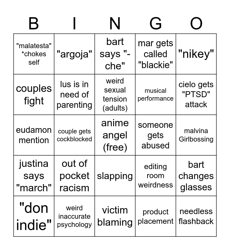 This bingo card has a free space and 34 words: alcohol, product placement, weird sexual tension (children), brba, justina says "march", lus is in need of parenting, "nikey", "don indie", "argoja", justina sounds, weird sexual tension (adults), bart says "-che", justina says something about death, cielo cries (and then it rains), someone gets abused, cielo gets "PTSD" attack, weird inaccurate psychology, eudamon mention, out of pocket racism, editing room weirdness, slapping, kissing, "malatesta" *chokes self, malvina Girlbossing, victim blaming, needless flashback, mar gets called "blackie", rama gets hurt (any pain), musical performance, couples fight, somebody faints, couple gets cockblocked, bart changes glasses and chris escapes house.