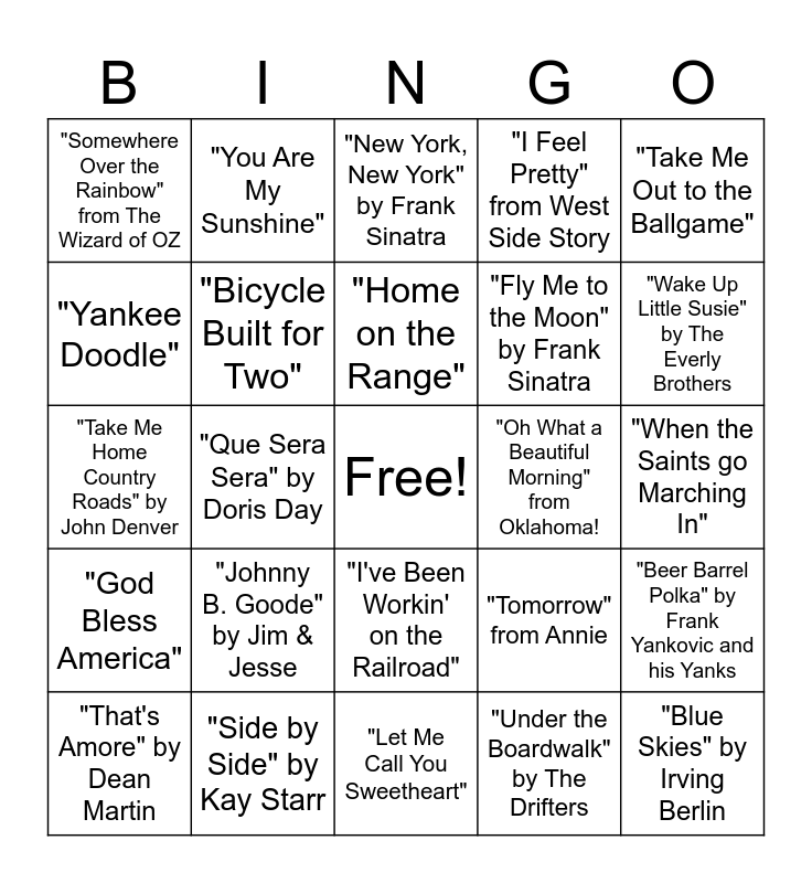 This bingo card has a free space and 24 words: "Johnny B. Goode" by Jim & Jesse, "Side by Side" by Kay Starr, "Home on the Range", "That's Amore" by Dean Martin, "Take Me Out to the Ballgame", "Somewhere Over the Rainbow" from The Wizard of OZ, "Yankee Doodle", "You Are My Sunshine", "Oh What a Beautiful Morning" from Oklahoma!, "I've Been Workin' on the Railroad", "Fly Me to the Moon" by Frank Sinatra, "Take Me Home Country Roads" by John Denver, "Tomorrow" from Annie, "Beer Barrel Polka" by Frank Yankovic and his Yanks, "Bicycle Built for Two", "Under the Boardwalk" by The Drifters, "When the Saints go Marching In", "New York, New York" by Frank Sinatra, "Wake Up Little Susie" by The Everly Brothers, "Que Sera Sera" by Doris Day, "Blue Skies" by Irving Berlin, "God Bless America", "I Feel Pretty" from West Side Story and "Let Me Call You Sweetheart".