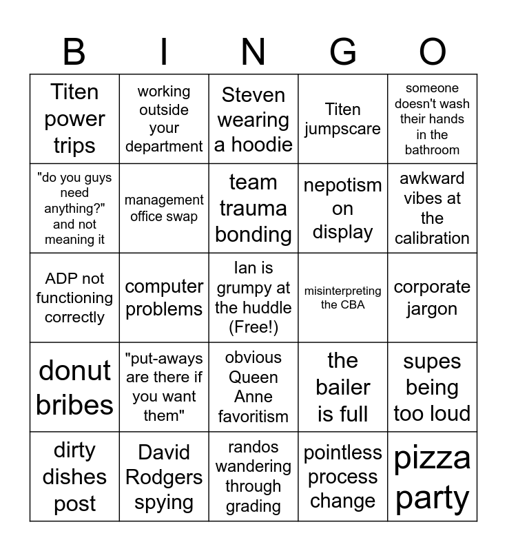 This bingo card has a free space and 35 words: "this isn't a warning", management trying to be chummy, malicious compliance with the contract, Titen jumpscare, supes being too loud, ADP not functioning correctly, management office swap, elevator stuck/broken, nepotism on display, a post only management likes, donut bribes, working outside your department, discipline meeting where they try to ask questions, David angry for no reason, Titen power trips, "put-aways are there if you want them", randos wandering through grading, misinterpreting the CBA, corporate jargon, dirty dishes post, David Rodgers spying, Steven wearing a hoodie, pointless process change, pizza party, "do you guys need anything?" and not meaning it, computer problems, obvious Queen Anne favoritism, Benjy gets targeted, awkward vibes at the calibration, thumbs down react on a teams post, free food in QA office post, team trauma bonding, the bailer is full, someone doesn't wash their hands in the bathroom and temps/QA slacking off.