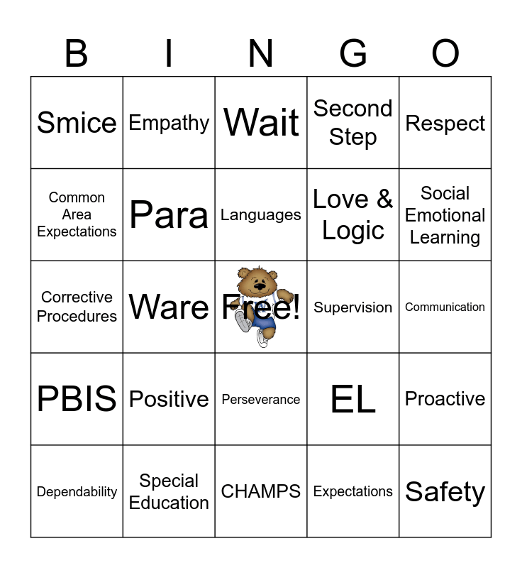 This bingo card has a free space and 31 words: CHAMPS, Relationships, Ware, Bear, Smice, Wait, Para, EL, Supervision, Expectations, Communication, Safety, Raptor, Vector, Social Emotional Learning, SIT, Proactive, Positive, PBIS, Perseverance, Respect, Integrity, Dependability, Empathy, Love & Logic, Common Area Expectations, Second Step, Corrective Procedures, Special Education, Languages and Kids.