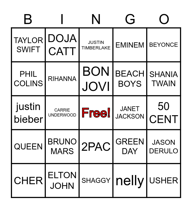 This bingo card has a free space and 54 words: PANIC! AT THE DISCO, QUEEN, JONAS BROTHERS, RUN DMC, 2PAC, JAY-Z, EMINEM, BEASTIE BOYS, PHIL COLINS, KATY PERRY, TAYLOR SWIFT, U2, ELTON JOHN, CHER, SPICE GIRLS, SHAGGY, USHER, BEACH BOYS, ARIANA GRANDE, 50 CENT, GREEN DAY, OUT KAST, JANET JACKSON, BEYONCE, ALICIA KEYS, DOJA CATT, TEMPTATIONS, MARVIN GAYE, VANESSA CARLTON, nelly, BILLIE EILLISH, MILEY CYRUS, PITBULL, THE WHITE STRIPES, JUSTIN TIMBERLAKE, T-PAIN, justin bieber, JASON DERULO, SNOOP DOGG, RIHANNA, MICHAEL JACKSON, BEE GEES, LP, FALL OUT BOYS, BRUNO MARS, CHRIS BROWN, TOM JONES, GUNS N ROSES, BON JOVI, CARRIE UNDERWOOD, SHANIA TWAIN, LUKE BRYAN, NOTOROUS B.I.G and MORGAN WALLEN.