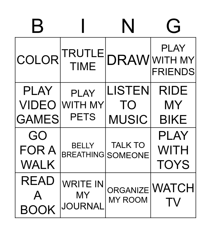This bingo card has a free space and 15 words: READ A BOOK, WATCH TV, DRAW, COLOR, RIDE MY BIKE, PLAY VIDEO GAMES, BELLY BREATHING, ORGANIZE MY ROOM, PLAY WITH MY PETS, GO FOR A WALK, PLAY WITH TOYS, PLAY WITH MY FRIENDS, LISTEN TO MUSIC, TRUTLE TIME and WRITE IN MY JOURNAL.