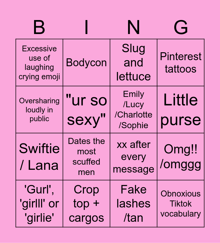 This bingo card has 16 words: Crop top + cargos, Omg!! /omggg, Slug and lettuce, Excessive use of laughing crying emoji, Swiftie / Lana, Bodycon, xx after every message, Fake lashes /tan, Oversharing loudly in public, "ur so sexy", 'Gurl', 'girlll' or 'girlie', Pinterest tattoos, Dates the most scuffed men, Little purse, Emily /Lucy /Charlotte /Sophie and Obnoxious Tiktok vocabulary.