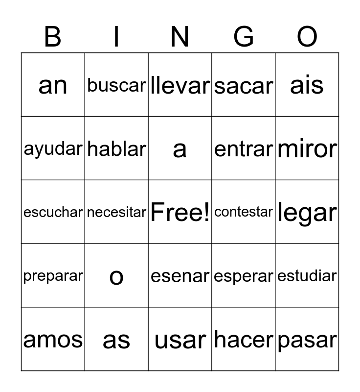 This bingo card has a free space and 24 words: o, as, a, amos, ais, an, ayudar, buscar, contestar, esenar, entrar, escuchar, esperar, estudiar, hablar, hacer, legar, llevar, miror, necesitar, pasar, preparar, sacar and usar.