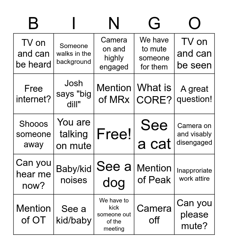 This bingo card has a free space and 24 words: Baby/kid noises, See a kid/baby, Mention of MRx, Mention of OT, TV on and can be seen, TV on and can be heard, Free internet?, Someone walks in the background, See a cat, See a dog, What is CORE?, Shooos someone away, Mention of Peak, Inapproriate work attire, Josh says "big dill", Camera off, Camera on and visably disengaged, Camera on and highly engaged, A great question!, You are talking on mute, Can you please mute?, Can you hear me now?, We have to mute someone for them and We have to kick someone out of the meeting.