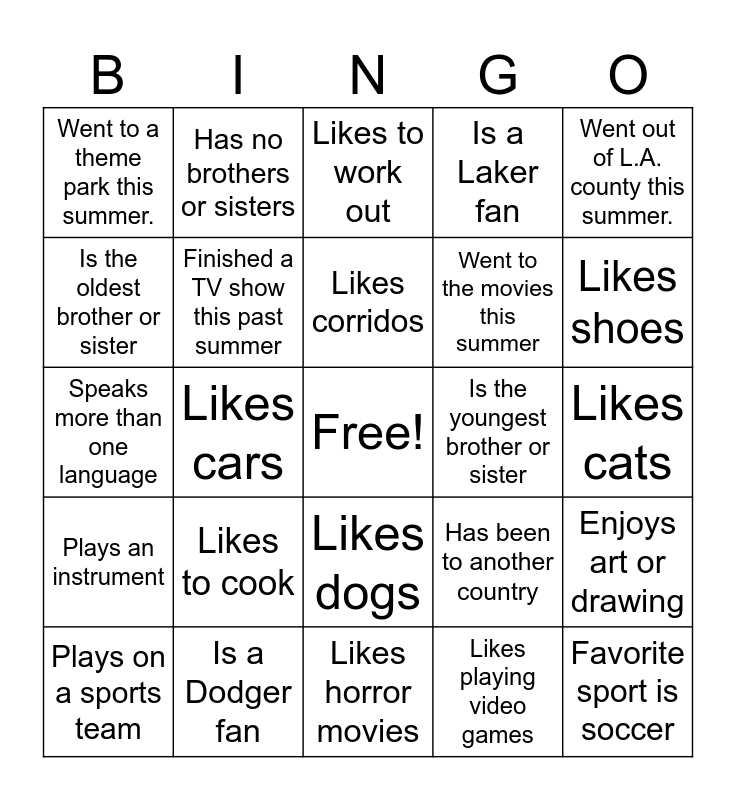 This bingo card has a free space and 24 words: Likes to cook, Is a Dodger fan, Likes corridos, Plays on a sports team, Went out of L.A. county this summer., Went to a theme park this summer., Is the oldest brother or sister, Has no brothers or sisters, Is the youngest brother or sister, Likes dogs, Went to the movies this summer, Speaks more than one language, Has been to another country, Enjoys art or drawing, Finished a TV show this past summer, Likes playing video games, Likes cats, Likes to work out, Likes shoes, Likes cars, Favorite sport is soccer, Plays an instrument, Is a Laker fan and Likes horror movies.