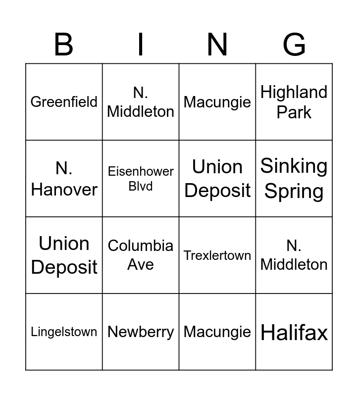 This bingo card has 39 words: Free!, Eisenhower Blvd, Mt. Rose Ave, Union Deposit, Columbia Ave, Millersville, Sinking Spring, Walnut Bottom, N. Hanover, Halifax, N. Middleton, Highland Park, Lingelstown, Macungie, Newberry, Market Plaza, LSC, Greenfield, Trexlertown, Whitehall, Eisenhower Blvd, Mt. Rose Ave, Union Deposit, Columbia Ave, Millersville, Sinking Spring, Walnut Bottom, N. Hanover, Halifax, N. Middleton, Highland Park, Lingelstown, Macungie, Newberry, Market Plaza, LSC, Greenfield, Trexlertown and Whitehall.
