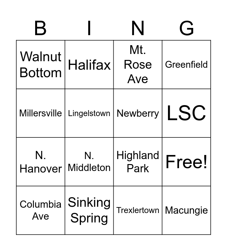 This bingo card has 20 words: Free!, Eisenhower Blvd, Mt. Rose Ave, Union Deposit, Columbia Ave, Millersville, Sinking Spring, Walnut Bottom, N. Hanover, Halifax, N. Middleton, Highland Park, Lingelstown, Macungie, Newberry, Market Plaza, LSC, Greenfield, Trexlertown and Whitehall.