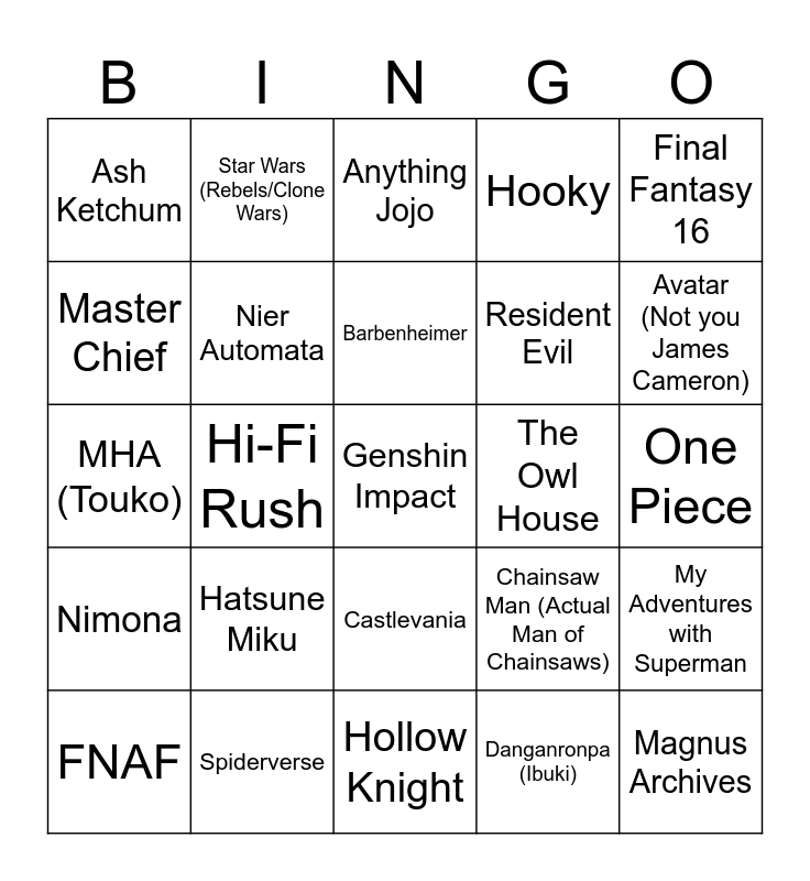 This bingo card has a free space and 24 words: Hatsune Miku, Spiderverse, Barbenheimer, FNAF, Final Fantasy 16, Ash Ketchum, Master Chief, Star Wars (Rebels/Clone Wars), The Owl House, Castlevania, Resident Evil, MHA (Touko), Chainsaw Man (Actual Man of Chainsaws), My Adventures with Superman, Nier Automata, Danganronpa (Ibuki), One Piece, Anything Jojo, Avatar (Not you James Cameron), Hi-Fi Rush, Magnus Archives, Nimona, Hooky and Hollow Knight.