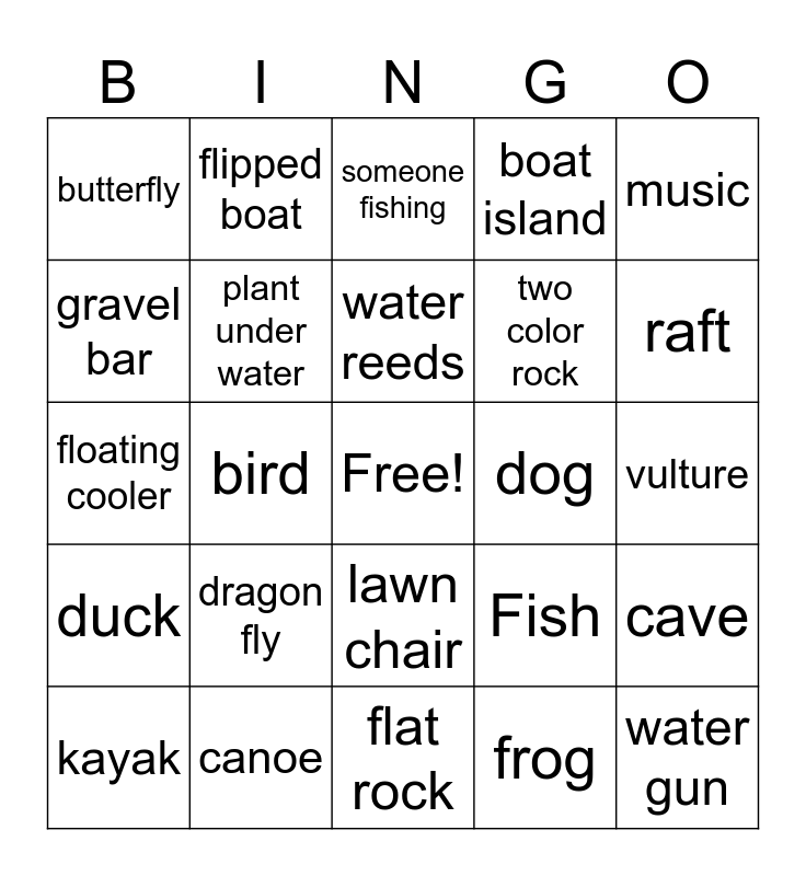 This bingo card has a free space and 27 words: Fish, Turtle, two color rock, flat rock, gravel bar, someone fishing, flipped boat, duck, dog, cave, floating cooler, boat island, kayak, canoe, raft, paddle, plant under water, water reeds, dragon fly, butterfly, vulture, frog, bird, water gun, lawn chair, music and person wearing life jacket.
